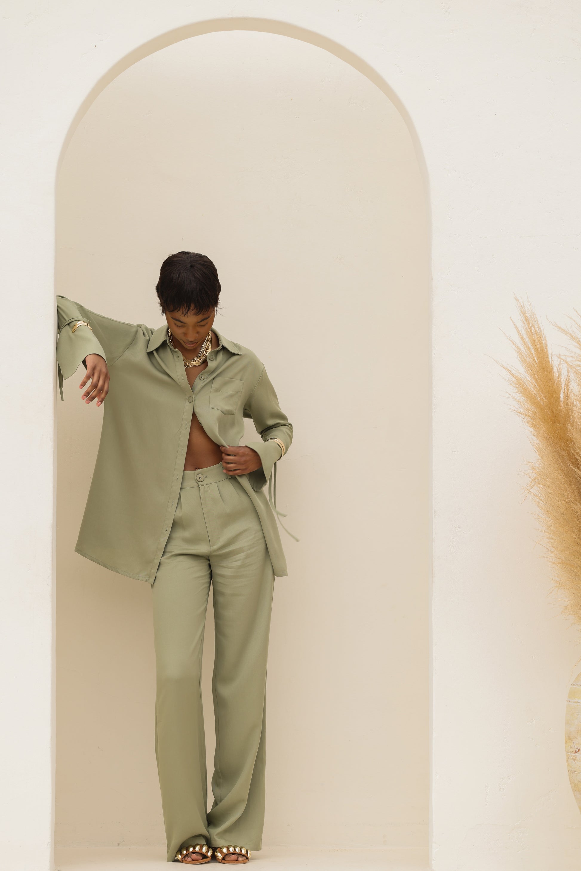 - Redefine effortless elegance with these sage green wide-leg pants, crafted from 100% Tencel™ Modal for a soft, breathable, and sustainable feel.